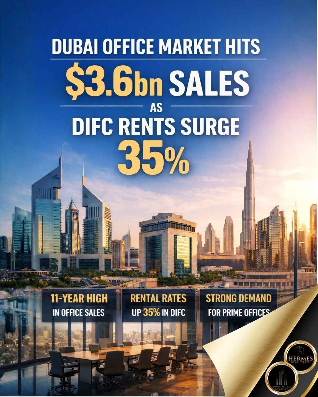 Dubai’s commercial real estate sector is reaching new heights, with the Dubai office market recording $3.6 billion in sales and hitting its highest level in 11 years. At the same time, office rents in DIFC (Dubai International Financial Centre) have surged by up to 35%, reflecting strong demand for premium office spaces in the city’s financial hub.